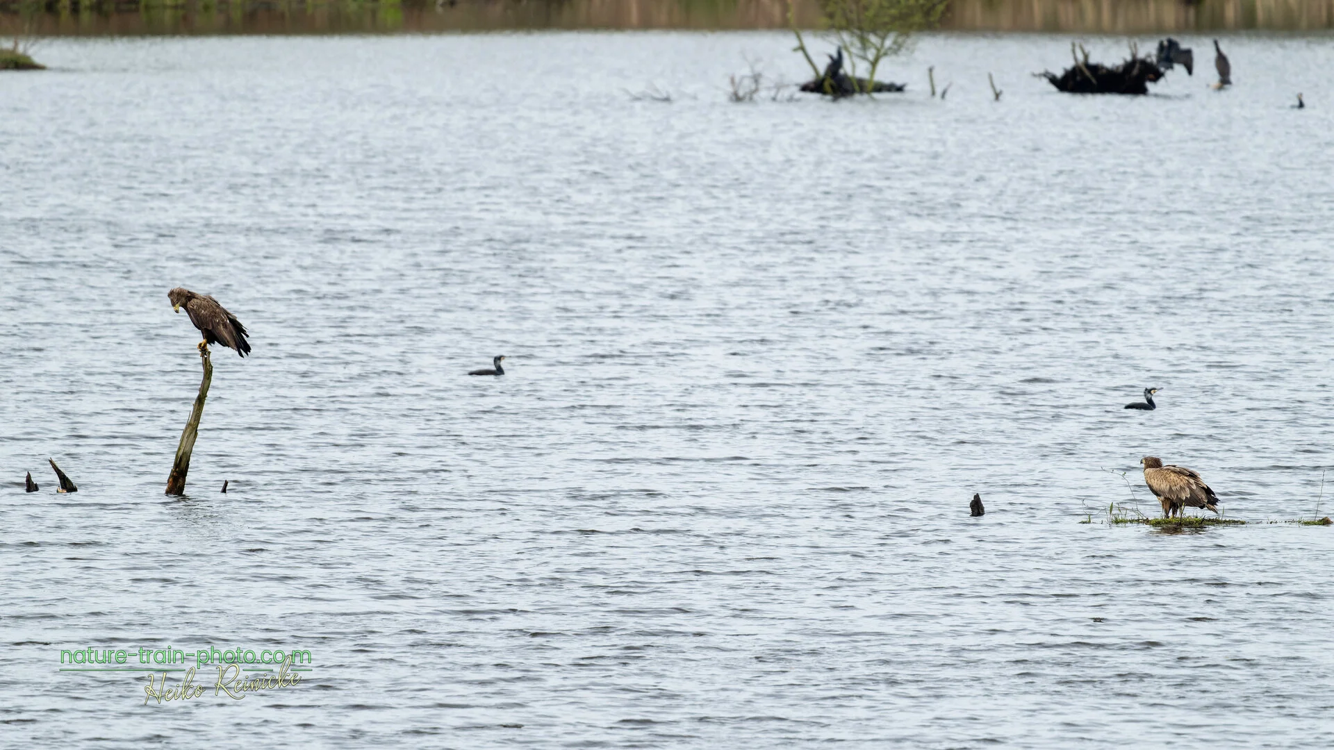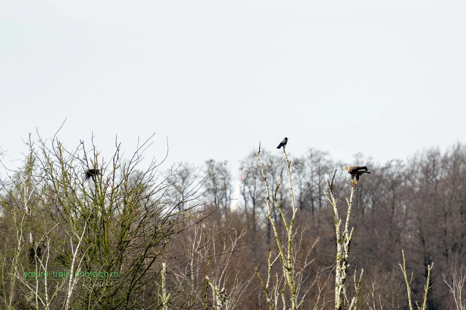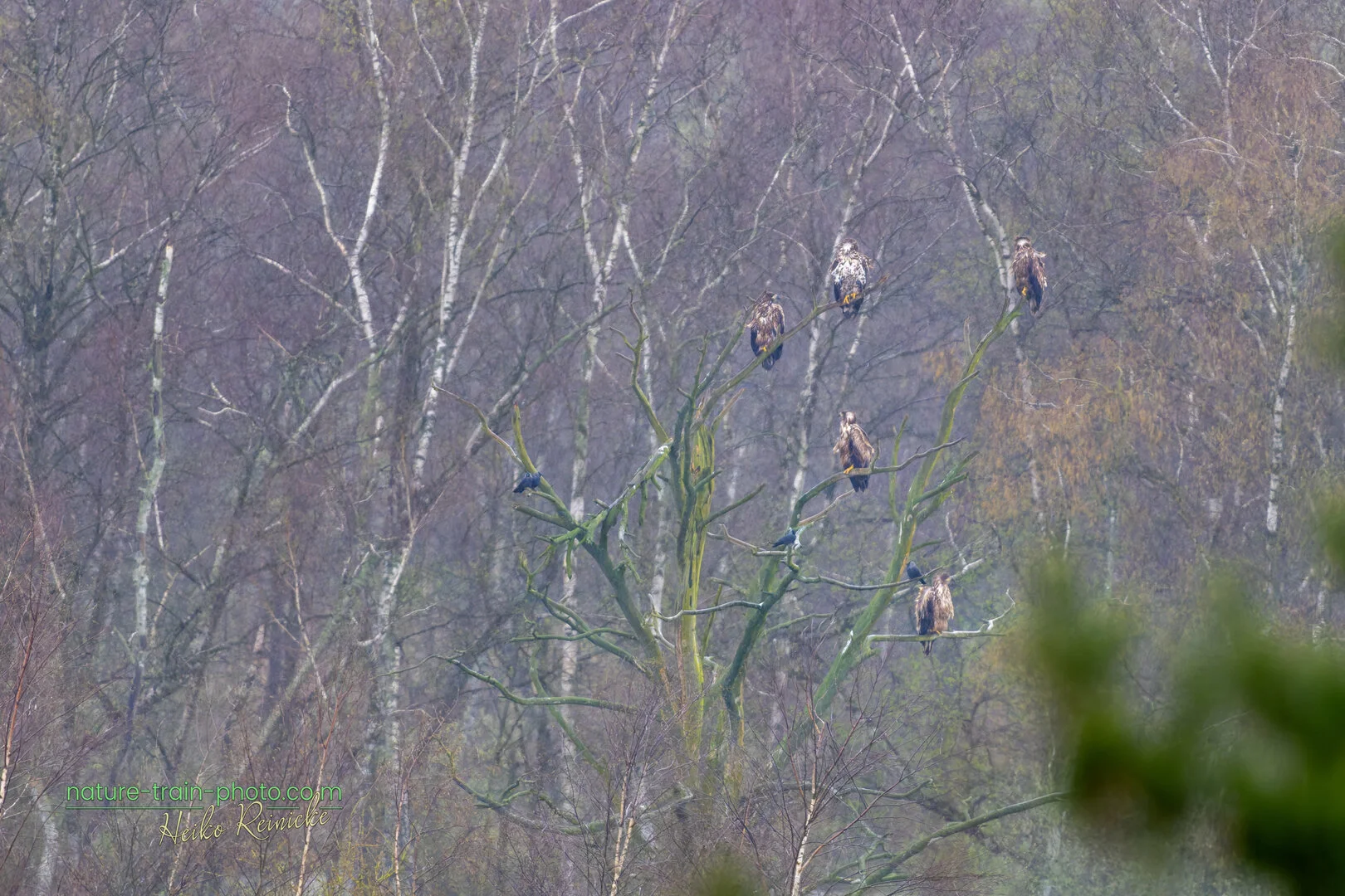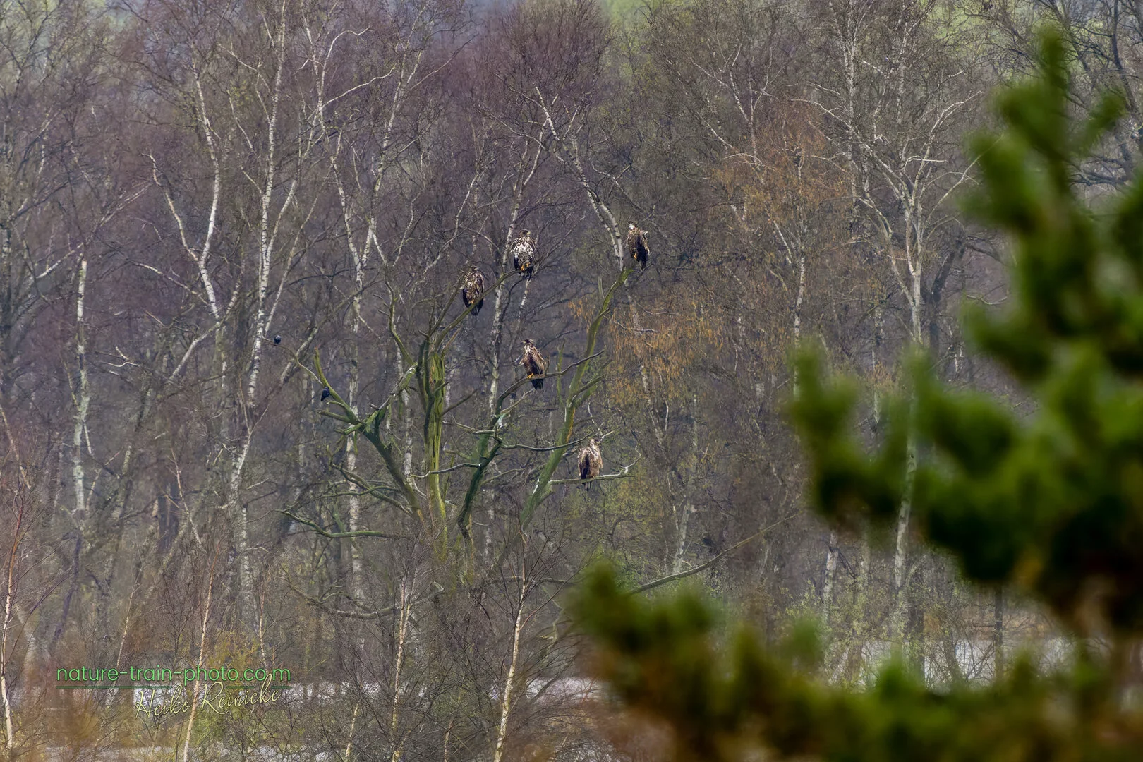 Bis zu neun Adler im Baum am See zählte ein Fotograf in der Woche zuvor und zeigte uns ein "Beweisfoto". Wir sahen sehr weit entfernt ganze fünf Seeadler in einen Baum am See sitzen und konnten es trotzdem nicht glauben.