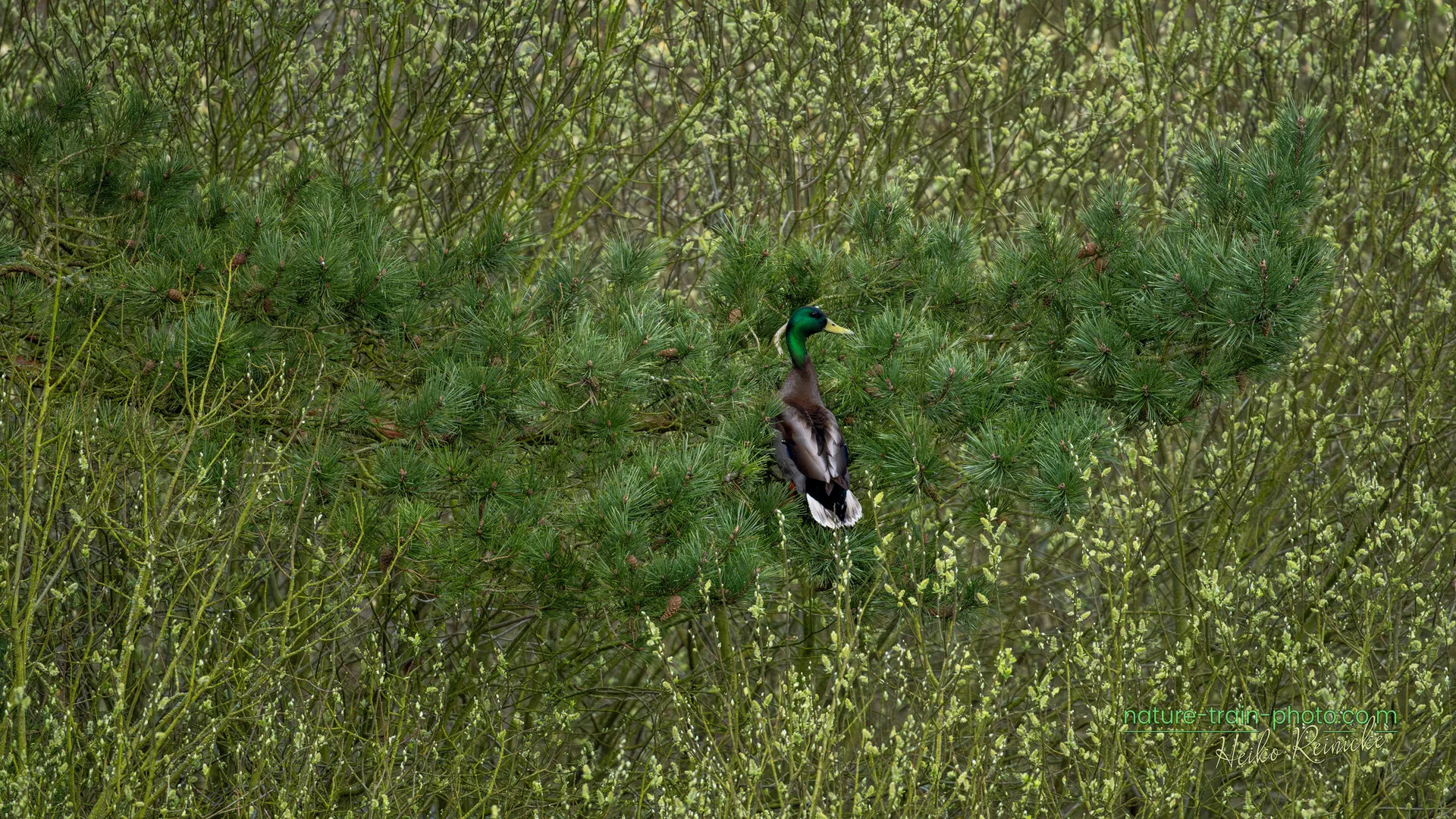 Aber auch einige andere Vögel ließen sich in der Zwischenzeit sehen. So versuchte eine Ente, genau wie die Reiher die Aussicht vom Baum her zu genießen.
